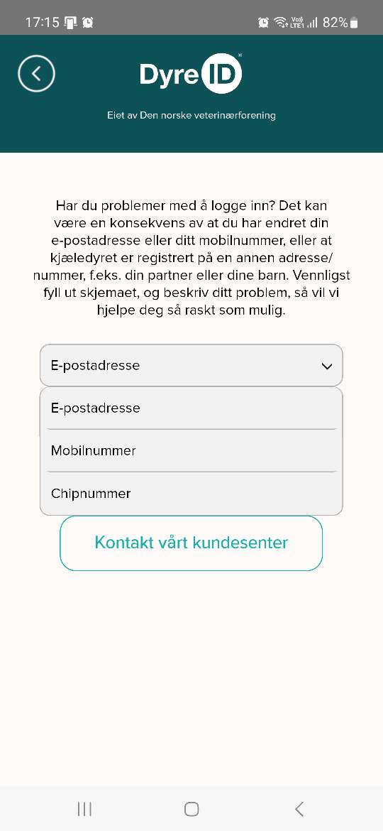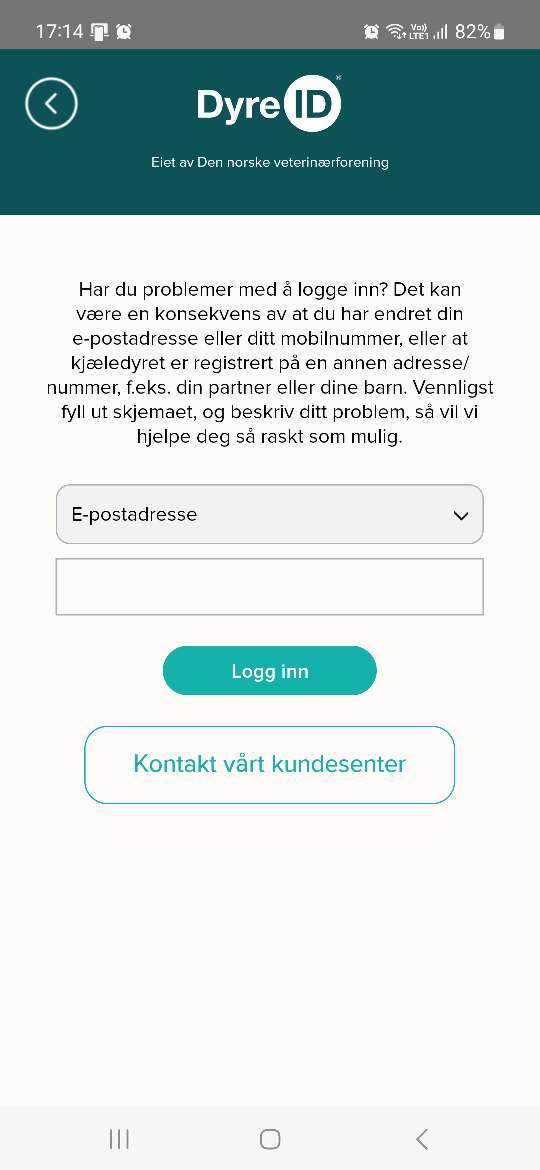 3) Dersom du ikke får logget inn i appen vil du komme til en side der du blir bedt om å oppgi e-postadresse, mobilnummer eller kjæledyrets ID-nummer så vi kan hjelpe deg med innlogging. Hvis dette ikke fungerer kan du trykke på knappen ‘Kontakt vårt kundesenter’, og beskrive problemet. Vi vil undersøke hva som kan være årsaken og ta kontakt med deg igjen.