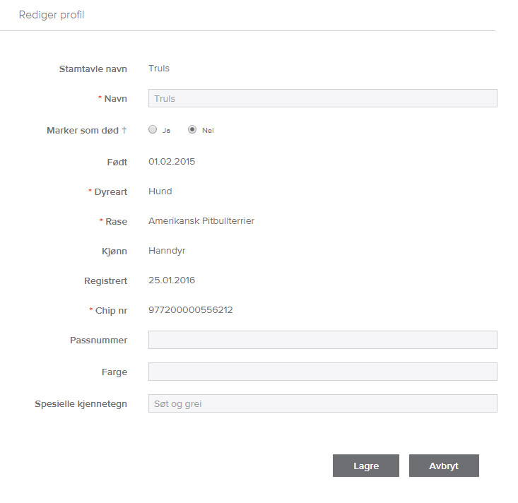 Annen informasjon om kjæledyret kan du selv oppdatere på Min side, gå inn på Kjæledyrprofilen til det aktuelle dyret, klikk «Rediger» og du kan redigere informasjonen i de åpne feltene. Husk å klikke «Lagre».