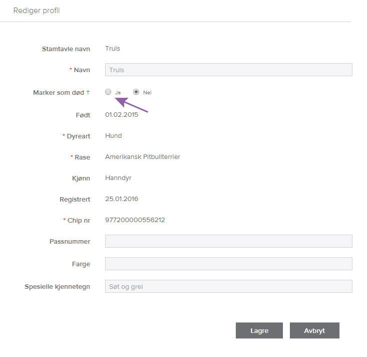 Dette markerer du selv øverst på siden, når du er inne og redigerer kjæledyrprofilen.