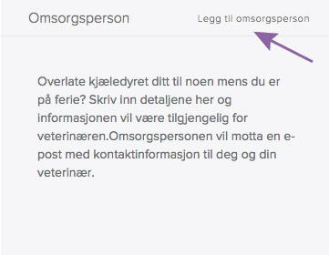 Omsorgsperson kan være aktuelt å legge til hvis du skal overlate kjæledyret ditt til noen når du reiser bort, og andre har ansvaret for ditt kjæledyr. Gå inn på kjæledyrprofilen til det aktuelle dyret, og klikk på «Legg til omsorgsperson».